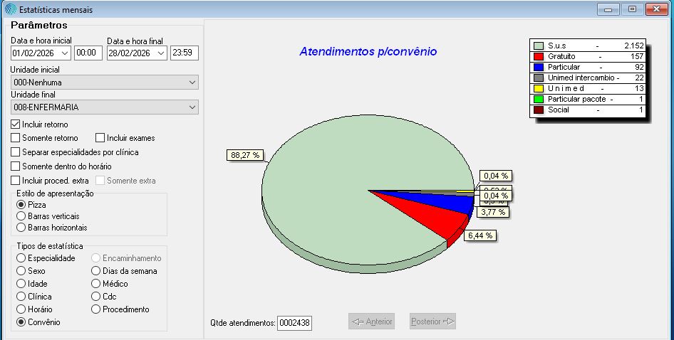 Do total de atendimentos, 2.152 foram realizados pelo Sistema Único de Saúde (SUS), representando cerca de 88% da demanda mensal. Também foram contabilizados 157 atendimentos gratuitos e 92 particulares, além de registros por convênios como Unimed Intercâmbio (22) e Unimed (13).