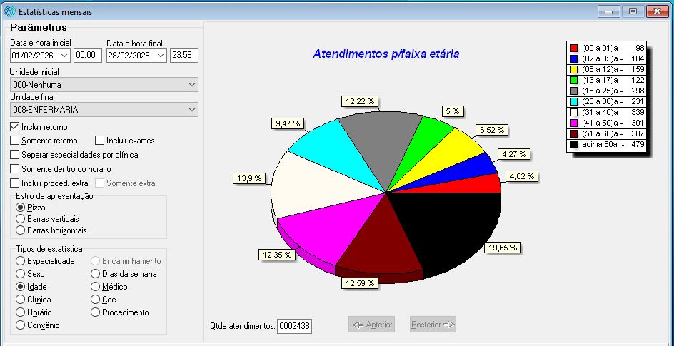 Entre as faixas etárias, o maior número de atendimentos foi registrado entre pacientes com mais de 60 anos, totalizando 479 atendimentos no mês.