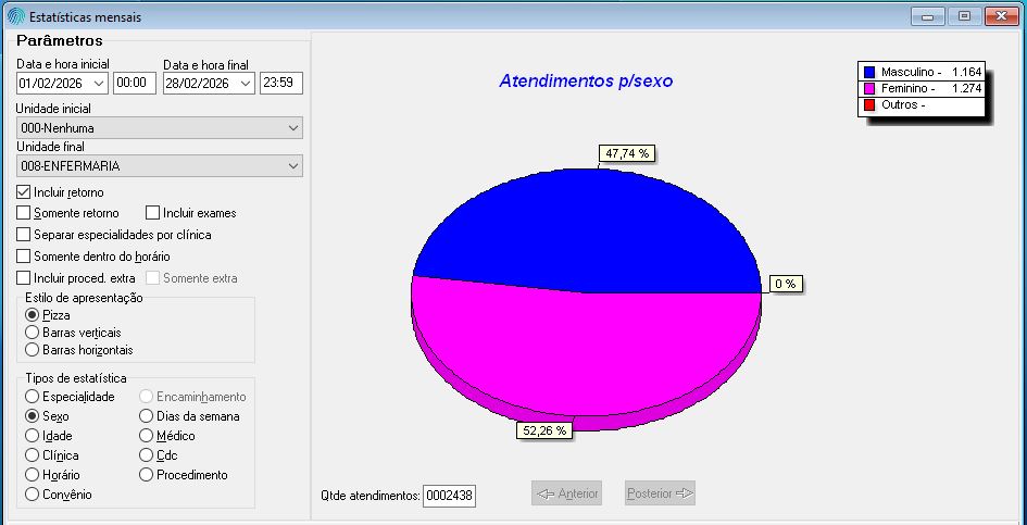 Os dados mostram que 1.274 atendimentos foram realizados em mulheres, o que representa 52,26% do total. Já 1.164 atendimentos foram de pacientes do sexo masculino, correspondendo a 47,74%.